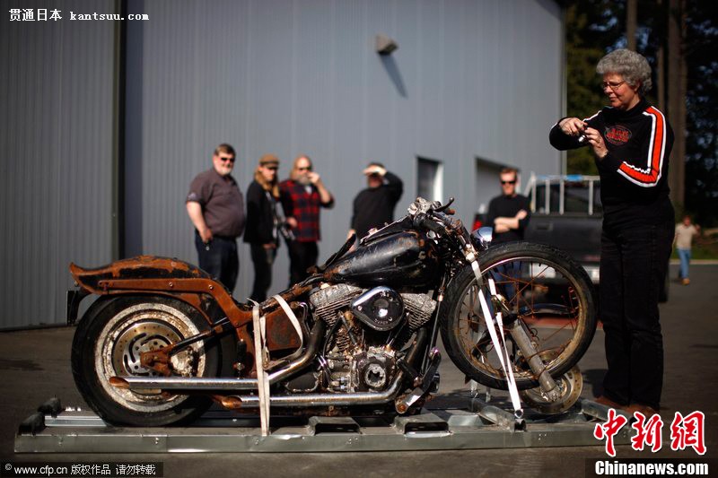 当地时间2012年5月6日,加拿大维多利亚,从日本漂到加拿大的摩托车。加拿大西部不列颠哥伦比亚省的格雷厄姆岛日前发现了一辆摩托车,可能是东日本大地震时因海啸冲走的。报道称,这辆哈雷戴维森公司生产的摩托车装在一个可能为卡车脱落的货箱内,牌照为日本宫城县,车主是29岁的横山。这辆摩托车即将回到日本。图片来源:CFP视觉中国 |