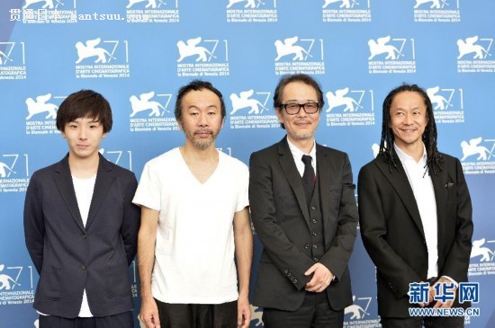 9月2日,在意大利威尼斯举行的第71届威尼斯电影节上,《平原野火》导演冢本晋也(左二)携主创人员出席拍照式。由日本导演冢本晋也执导的《平原野火》将参与主竞赛单元的评选。(新华社记者 刘力航 摄) |