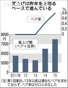 労働組合を束ねる連合は20日、2015年の春季労使交渉の第1回回答集計をまとめた。定期昇給とベースアップ(ベア)を合わせた賃上げ額の平均は7497円と前年の第1回集計を1006円上回った。賃上げ率にすると2.43%で、同0.27ポイント上がった。いずれも2001年以降では最も高い。昨年を上回るペースで賃上げが広がりつつある。