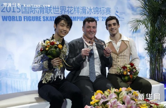 3月28日,西班牙选手哈维尔·费尔南德斯(右)与日本选手羽生结弦(左)将奖牌挂在他们的共同教练布莱恩·奥瑟的脖子上。当日,在上海举行的2015年国际滑联世界花样滑冰锦标赛男子单人滑比赛中,西班牙选手哈维尔·费尔南德斯以273.90分的总成绩获得冠军。日本选手羽生结弦以271.08分的总成绩获得亚军。这两位选手都师从加拿大名教练布莱恩·奥瑟的门下。新华社记者王丽莉摄 |