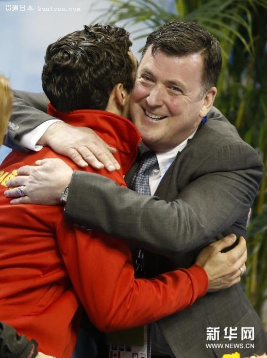 3月28日,西班牙选手哈维尔·费尔南德斯在得知成绩后得到自己的教练布莱恩·奥瑟的祝贺。当日,在上海举行的2015年国际滑联世界花样滑冰锦标赛男子单人滑比赛中,西班牙选手哈维尔·费尔南德斯以273.90分的总成绩获得冠军。日本选手羽生结弦以271.08分的总成绩获得亚军。这两位选手都师从加拿大名教练布莱恩·奥瑟的门下。新华社记者王丽莉摄 |