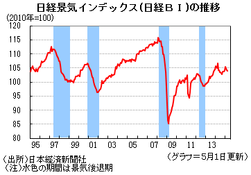 日本経済新聞デジタルメディアが5月1日に算出した2015年3月の日経景気インデックス(日経BI、速報値)は前月から0.2ポイント低下し104.0(2010年平均=100)となった。低下は2カ月連続。内閣府が景気動向指数による基調判断に使う3カ月移動平均では、日経BIは7カ月ぶりに前月比マイナスに転じた。マイナス幅は小さく、現時点では景気が足踏みしているとまでは言えないものの、改善の勢いは鈍化した形だ。 景気の水準と勢いを示す日経BIは、鉱工業生産、所定外労働時間、有効求人倍率、商業販売額の4指標に共通する「景気の波」を取り出して指数化している。 ■3月は2指標が悪化