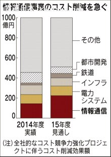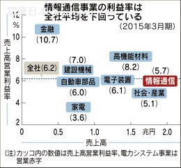 斉藤氏は収益力の伸び悩みを「国内通信大手の設備投資の圧縮の動きを読み間違えた」と説明したが、会場から「目標管理などの手法に問題があるのではないか」(ゴールドマン・サックス証券の松橋郁夫アナリスト)との疑問も出た。日立化成や日立金属などの上場子会社より利益率が低く「外部の目が行き届かず、ぬるま湯体質に陥っている」との見方もある。 インフラなど多くの事業は茨城県日立市をルーツにするが、情報通信事業は東京・大森を本拠地とし、電電公社(現NTT)ファミリーとして育ってきた。安定して収益を稼ぎ出す「優等生」は、社内で「マル情」と呼ばれてきた。聖域化していたとの指摘もあり、リストラの遅れにつながった可能性がある。 人材が情報通信畑だけで育つことも多く、独立色の強さに拍車をかけていた。インフラ部門などとの人事交流も少なかったが、顧客の動きを機敏にとらえて事業戦略を組み立てるために連携強化に動き出している。 情報通信事業に懸かる期待は大きい。「日立の強みは米ゼネラル・エレクトリック(GE)、独シーメンスと違いIT部門を持っていること」(中西宏明会長)だからだ。あらゆる機器がインターネットでつながる「IoT(インターネット・オブ・シングス)」時代の到来は大きなチャンスだ。だが、それは情報通信事業の強さが他事業の競争力に直結するということでもある。