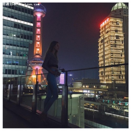 米莲娜·瓦茨克在上海夜幕下的照片。 |