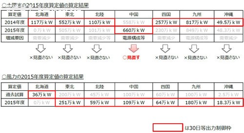 2015年度估算值的估算结果 (出处:经济产业省) 关于可并网量,在上次系统工作组会议上,把从2015年度开始的“可并网量”概念分为两个,分别确定了要按年度再计算的“每年度估算值”,和在实际输出控制中适用30日(或者360小时)规则的上限值(对象范围)的“30日等输出控制上限”,并将每年度发布。 光伏发电2015年度的估算值,7家电力公司中5家减少,2家增加。北海道电力、东北电力、北陆电力、四国电力和冲绳电力5家电力公司因电力需求减少等,2015年度的估算值减少。而中国电力和九州电力虽然电力需求减少,但两公司均决定了基础电源核电的废堆(九电为玄海1号机,中国电力为岛根1号机),因此接受光伏电力的空间扩大,2015年度的估算值增加。 上次系统工作组会议,制定了当新一年度的估算值增加时,若是由于电源构成的变化等结构原因,则30日等输出控制上限也将增加。但对并网申请量已经超过可并网量(2014年度估算值)的电力公司而言,即使估算值增加,也不会变更30日等输出控制上限的方针。此次根据这一点,增加了中国电力的30日等输出控制上限。 风力发电方面,结合日本风力发电协会(JWPA)提议的输出控制方法,重新计算并公布了2015年度的可并网量。除北海道电力以外的其他6家电力公司2015年度的估算值均为增加,30日等输出控制上限也随之扩大。 |