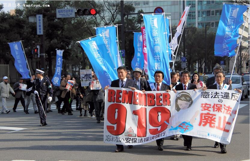 在福冈市内,要求废除安保法、进行游行抗议的律师们。(网页截图)