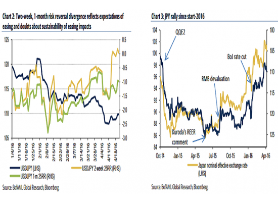 美元兑日元的上涨助推日本股市的上涨,但是美银美林表示其将逢高抛售。 美银美林表示,因美元兑日元与日本股市具有相关性,所以其预计美元兑日元将在110关口上方保持短暂复苏态势,但是这种相关性影响难以持续。日本央行的ETF购买短期内会直接冲击日本股市的供给和需求,但是其长期内对日本经济以及市场风险情绪的影响尚不得而知,虽然日本央行对日本股票的购买,不可能导致日本的资金流出日本国内市场。相反,日本央行的资产购买可能导致外国资金涌入日本市场,当然这可能是因为外汇对冲原因所致。 持续两周的货币市场风险逆转在下周日本央行会议来临之前已经出现大幅修正,因为市场对日本央行的行动预期增至历史高位,但是月内的市场风险逆转不大。 这反映出(1)、日本央行行动预期的增加;(2)、由于此前美元兑日元走低以及日元多头头寸的仓位,预计日本央行潜在宽松举措的短期影响较大;(3)另一方面预计中期影响有限。美银美林表示这很大程度上基本符合其此前观点。 美银美林认为,由于市场预计日本央行将实施定性的宽松措施,所以逢高做空美元兑日元是一个健全的外汇策略。