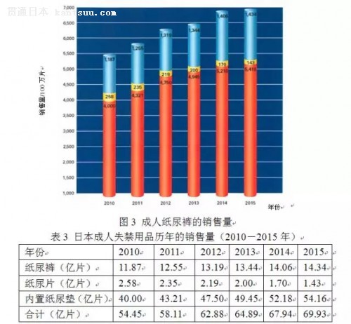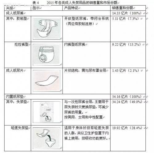 2015年日本国内市场成人失禁用品的销售额为18亿日元;销售量69.93亿片,同比增长3%。其中纸尿裤14.34亿片,纸尿片1.43亿片,内置纸尿垫69.93亿片。纸尿裤类产品又可分为胶粘型和拉拉裤型,内置纸尿垫又可分为失禁垫和轻度失禁垫。