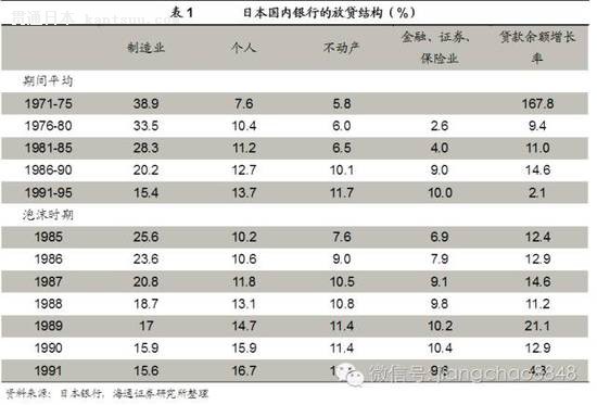 同时,金融自由化改革导致银行信贷倾向于房地产市场,助推了房价上涨。 金融自由化是指当时日本进行的利率自由化、资本项目开放、放松证券市场管制等多方面的改革。首先,证券市场管制放开使大企业纷纷“去银行化”,银行贷款业务扩张受阻、失去了稳定的企业贷款收入来源。其次,利率自由化改革又使银行不得不提高存款利率以吸引更多的存款,抬升负债成本。出于盈利压力,日本银行体系改变经营方式,向不动产、非货币金融机构等领域大量发放贷款。 下表给出了当时日本国内商业银行贷款方向的一些数据。银行对制造业的贷款占比从70年代前半期的39%下滑到80年代后期的20%左右,并在90年代一直保持了下滑的走势。与制造业相比,同期银行对个人(按揭贷款为主)、房地产以及对非货币金融机构的贷款比例均上升,在80年代后半期尤其明显。其中,对房地产和金融、证券和保险业的贷款,80年代后期比前期翻了一番。金融、证券和保险业中包括非货币金融机构,这一部分的贷款又被转贷、投向房地产市场。