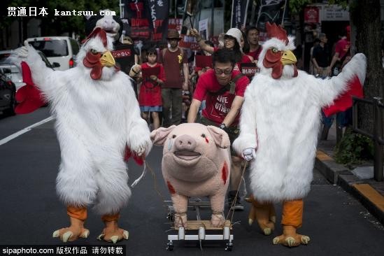 日本民众扮公鸡拉小猪出街抗议 呼吁关闭屠宰场