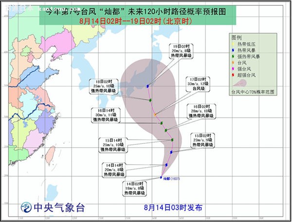 天气网今 年第7号台风“灿都” (热带风暴级,英文名:CHANTHU;名字来源:柬埔寨;名字意义:一种花)于今天(14日,北京时,下同)凌晨2点钟在西北太平洋洋面上生成,凌晨2点钟其中心位于日本东京偏南方约1780公里的洋面上,就是北纬19.8度、东经141.7度,中心附近最大风力有8级(18米/秒),中心最低气压为998百帕,7级风圈半径100-250公里。 预计,“灿都”将以每小时25公里左右的速度向偏北方向移动,逐渐向日本东南部洋面靠近,强度逐渐加强。
