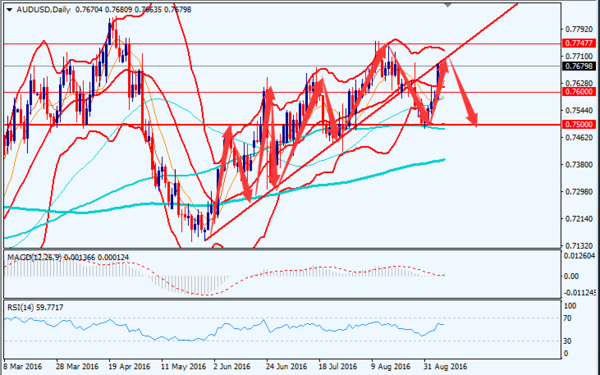 日线图上,澳元/美元下破上行趋势线后,汇价短期在0.75强支撑位反弹下行,目前汇价在上行趋势线处受阻,若汇价后市下跌,则趋势可能已反转,转为下行趋势;目前,汇价短期前景不明朗,但是长期来看,趋势看跌,汇价将下测0.7600,并将进一步下跌至0.7500。