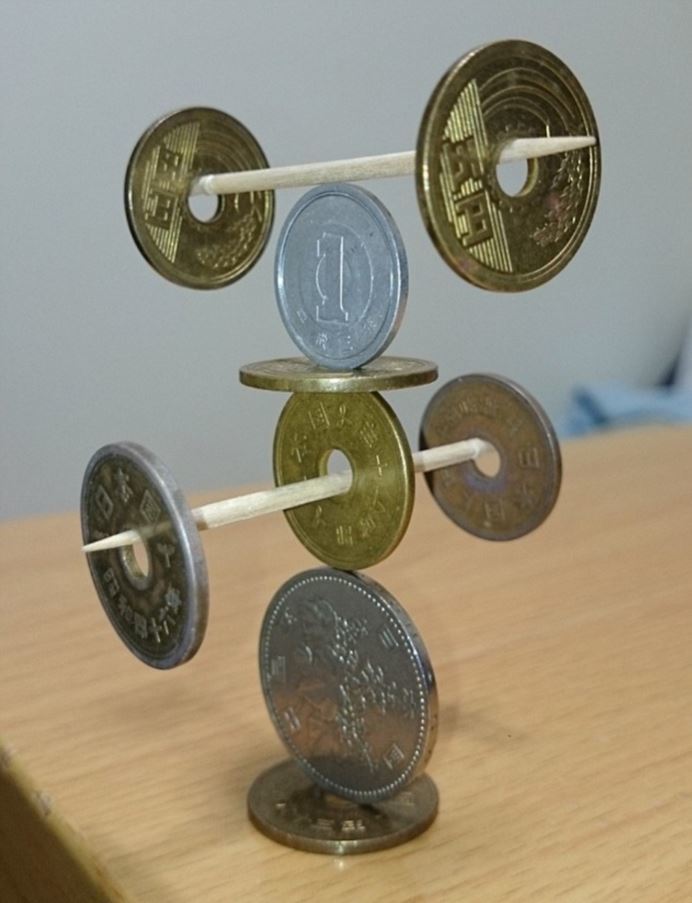 Tani先生甚至可以用牙签把硬币串起来,然后立在竖立的另一枚硬币上。 |
