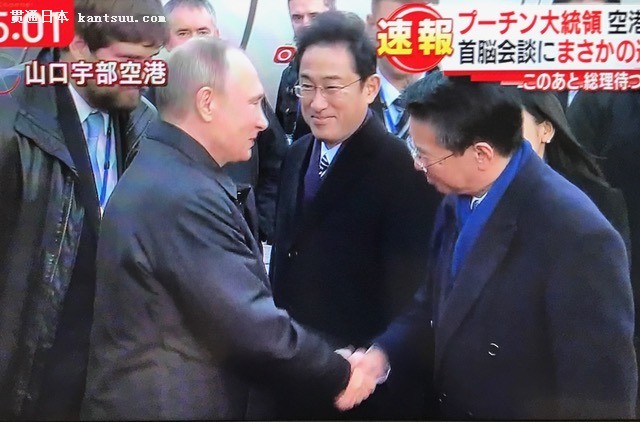 岸田文雄和山口县知事等到机场迎接普京。 安倍把与普京进行领土问题交涉的会谈场所选在了祖籍山口县长门市的温泉。上午10时左右,安倍晋三从东京出发,乘坐专机前往会谈举行地山口县。11时30分左右抵达山口县山口宇部机场,随后前往长门市温泉旅馆。