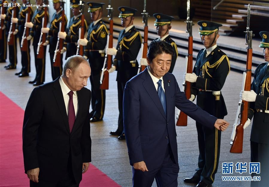 12月16日,在日本东京首相官邸,日本首相安倍晋三(左二)与俄罗斯总统普京(左一)检阅仪仗队。当日,日本首相安倍晋三在东京首相官邸举行仪式欢迎俄罗斯总统普京。 新华社发
