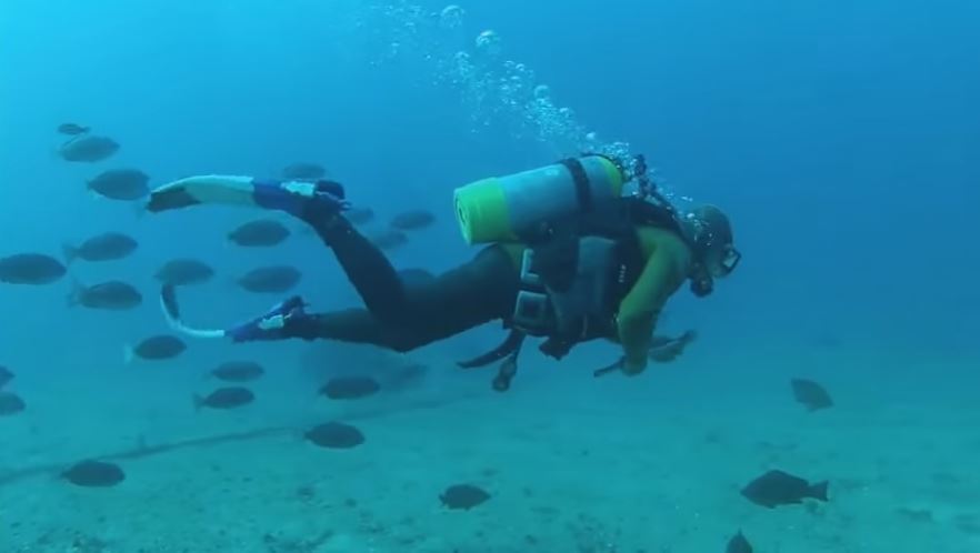 荒川博幸是当地的一位潜水员,主要负责照看管理水里的立山神社,这份工作他已经做了二十五年了。与此同时他还兼职当一名潜水向导,给其他游客介绍海里的鱼类。图为荒川在潜水。 |