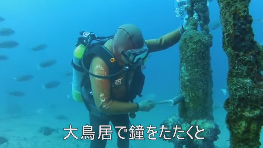 某次给游客介绍鱼类时,他和一条亚洲羊头濑鱼成了好朋友。每次他用“暗号”呼叫它,这条大鱼就会马上游过来向他示意。所谓的“呼叫暗号”,其实是荒川博幸用一直铁锤敲打金属片的声音,一听到这个声音,这条鱼就会现身。图为荒川在敲打神社呼叫“好友”。 |