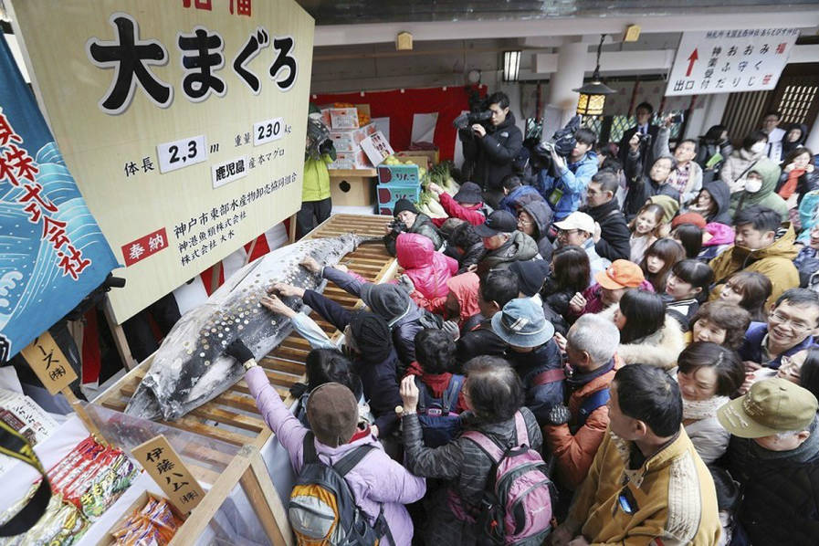 据日本西宫神社介绍,“十日惠比寿”活动将于9日开始,自1970年起神户市东部水产批发商协会联合会每年都会供奉金枪鱼,祈求渔业丰收、生意兴隆。身着黑色短褂的联合会工作人员等约15人将金枪鱼供奉在神社内,这条金枪鱼在鹿儿岛县捕捞上岸,长约2.5米,重约250公斤,做成刺身可供约1300人享用。 |