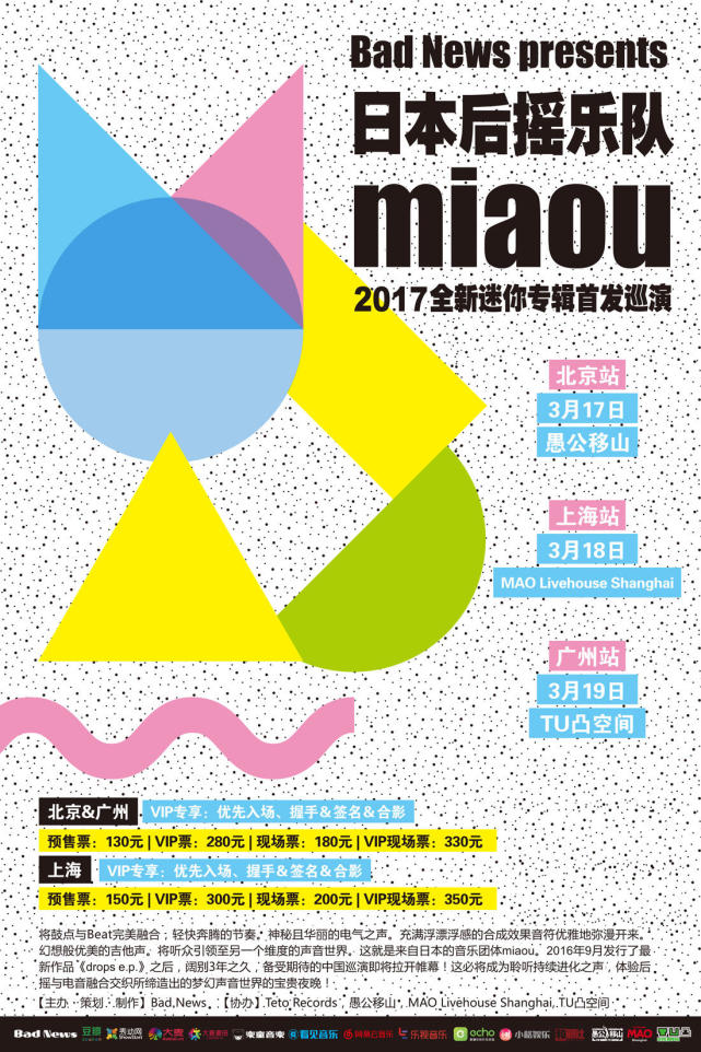 腾讯娱乐讯 将鼓点与Beat完美融合,轻快奔腾的节奏。神秘且华丽的电气之声。充满浮漂浮感的合成效果音符优雅地弥漫开来。幻想般优美的吉他声。将听众引领至另一个维度的声音世界。这就是来自日本的音乐团体 miaou。2016年9月发行了最新作品《drops e.p.》之后,阔别3年之久,备受期待的中国巡演即将拉开帷幕!这必将成为聆听持续进化之声,体验后摇与电音融合交织所缔造出的梦幻声音世界的宝贵夜晚! 关于miaou 1999年,由长谷川姐妹组成于神奈川滨崎。由toe的美浓隆章操刀制作的3张专辑(《Happiness》 2003年,《Make These Things Alright》 2005年,《All Around Us》 2008年)引起了广泛关注。 从2005年开始,乐队开展了一系列活动,诸如成立厂牌-Teto Records,策划国外乐队的日本巡演以及发行磁带等等。除了与许多国外乐队同台演出之外,也常常登上英国,爱尔兰,中国,台湾等国外舞台。他们独特的旋律与略带忧伤的声音,在国内外的器乐演奏界都获得了高度评价。 2011年发行了第4张专辑《The Day Will Come Before Long》。本作加入了Guest Vocal,展现了乐队新的音乐取向,并同时发行了由国内外艺人参与制作的Remix专辑《The Night Will Come Before Long》,以及在希腊的Sound In Silence厂牌下发行的《Bring The Lights EP》。此后,经历了成员各自的独立发展,于2016年秋季发行了最新专辑《drops e.p.》。 成员: 滨崎龙树(Guitars, Programming, Vocals...) 长谷川真弓(Bass, Synthesizer, Rhodes, Glockenspiel...) 长谷川宏美(Drums) 关于Bad News 成立于1989年的Bad News,是日本知名独立厂牌。日本乐队くるり,中国乐队脑浊、美日乐队ShinSight Trio等知名乐队都曾签约旗下。厂牌发行各类海内外艺人唱片,多达500张以上。2011年起,制作了日本顶级音乐盛会SUMMER SONIC 音乐节中ISLAND STAGE - Asian Calling 舞台,梁博,重塑雕像的权利,后海大鲨鱼,木玛、逃跑计划等中国乐队都曾强势登陆ISLAND STAGE。近年,厂牌又开始策划执行日本艺人中国区巡演。民谣艺人辻亜弥乃,humberthumbert以及以JAZZ HIP HIP/CLUB MUSIC为主的《Fuse》系列活动,以唱见为主的《CONNECT series》系列活动等。所有活动都旨在通过音乐,建立起日本与中国文化交流的桥梁。 【北京站】 时间:2017年3月17日(周五)20:30 地点:愚公移山(北京市东城区张自忠路3-2号) 【上海站】 时间:2017年3月18日(周六)20:30 地点:MAO Livehouse Shanghai(上海黄浦区重庆南路308号3楼 近建国中路) 【广州站】 时间:2017年3月19日(周日)20:30 地点:TU凸空间(广州市越秀区广州大道中361-365号东方花苑首层) |