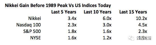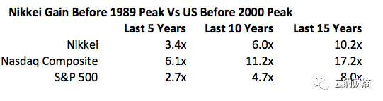 日经指数长期、持续、没有回调以及最终抛物线式的走势几乎是空前绝后的。这与美股迄今为止的上涨是不同的。过去十年标普500指数的涨幅只有日经最高涨幅的1/4(日经包含了225家日本最大的上市公司;标普500指数是美国与之最有可比性的股指)