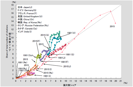 1981年—2015年,日本科技成果跟随其经济发展,经历了一个先盛后衰的过程,论文被引用次数从5%跃升到了世界8%以上,然后随着失去的20年直线下降,来到了3.5%左右的位置。 |