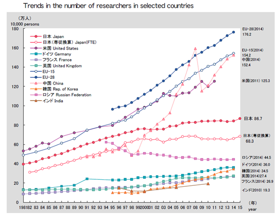 我在之前的文章里面写过,中国自从2010年在经济总量上超过日本以后,总体科技产出现在也超过了日本,仅次于美国,事实上日本在基础研究领域下滑非常严重,不仅已经落后于中国,而且被英国和德国也甩在了后面。 2017年6月13日,日本经济新闻发布了一篇新闻报道,叫做全球科技进入中美两强时代,说明日本媒体也在开始逐渐正视现实,那就是中国和美国不仅在经济总量上领跑全球,在最新科技发展上也是全球两大核心力量。 实际上最近几年中国科技的井喷式进展大家也有感受了,军事上国产航母下水,国产万吨大驱下水,新式火箭进入太空,货运飞船成功发射,智能手机里面开始逐渐用上了国产芯片,超级计算机领跑全球,量子通信,第五代移动通信都处于世界一流水平等等。 今天我们从日本人的视角来看下中国科技的实力究竟怎么样。 日本文部科学省官方每年都会对世界各国科技实力产出进行数据统计,以下的内容全部来自日本文部科学省2016年版报告,这个报告很长,我今天把这个报告的主要内容整理了下,有以下的内容。 1:中国的科技投入在2013年超过日本,同时在2014年达到了整个欧洲的56%,是仅次于美国的世界第二大科技投入国 首先看下图是世界各国投入到R&D研发的经费支出,按照日本人的统计,中国的科技研发支出在2013年和日本进行了一个交叉,在2013年研发支出超过了日本,2014年更是超过日本17.9%,达到22.4万亿日元。实际上,今天中国的研发支出已经是日本的两倍了。 当然,韩国也进步神速,2014年研发费用超过了英国,和法国差不多。韩国崛起非常明显。