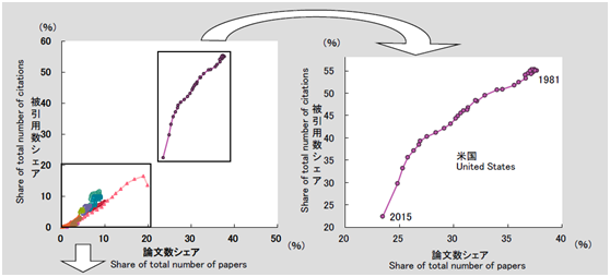 再看看除了美国以外的世界其他国家。 下图中,横坐标是论文数量,纵坐标是论文被引用次数。 1981年,世界基础科学研究第二强国是英国,论文被引用次数占了全球10%左右, 德国世界第三,被引用次数占全球大约6%,日本世界第四,占世界大约5%。 中国呢?1981年论文被引用次数占全球1%以下。 到了2015年,中国发表的论文被引用次数已经占到了全球的13.5%左右,跃居世界第二,对比下世界第一的美国是22%。世界第三是英国,大约7%,世界第四德国,大约6.7%, 右上角一枝独秀的就是中国,下图不包含美国。