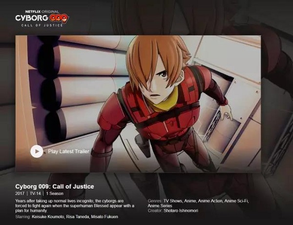《哥斯拉:怪兽惑星》 另一家和Netflix关系密切的动画公司是Production.I.G,双方在2016年初就宣布要制作一部原创科幻题材动画《Perfect Bones》,由中泽一登导演,预计将于明年与各位观众见面。 而双方合作的另一部作品,由神山健治总监督、柿本广大执导的《人造人009:正义召唤》已于2016年11月正式播出了。值得一提的是,这一作在上映时也采用了Netflix独特的整季播放策略,即将全部12集一起放出,而非传统新番每周一集的播放形式。