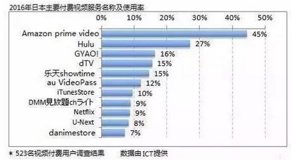 2015年,Netflix正式宣布了其全球化计划,要将其线上流媒体播放业务从美国推广到全世界每个角落,日本自然是其中一块必争之地。而要在日本吸引观众,那么动画方面的内容就必不可少了。此前,Netflix上就已有不少日式动画内容: 但大多都以经(过)典(气)作品为主,而在进军日本后,Netflix购买了包括《进击的巨人》等热门新番在内的版权,正式加入了日式动画播放产业的争夺。 在日本本土的动画领域,Netflix是以挑战者的姿态出现的:2016年的一项调查显示,日本观众最常用的在线付费视频服务是Amazon Prime和Hulu两家,这两家在Netflix进入前就深耕多年,而随后的GYAO、乐天showtime等作为本土厂商也拥有天然优势。Netflix想在相当固化的日本市场中闯出一条新路可以说是困难重重: