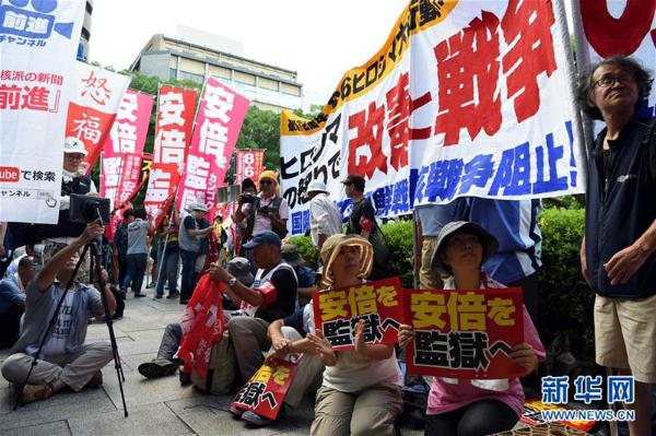 8月6日,在日本广岛原子弹爆炸遗址前,抗议民众手持标语参加集会。 日本广岛市6日在和平纪念公园举行原子弹爆炸72周年纪念活动。从全国各地赶来的数百名民众当天聚集在活动现场附近,抗议首相安倍晋三出席纪念仪式,并要求安倍下台。新华社记者 马平 摄 |