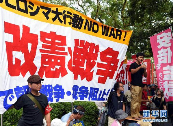 8月6日,在日本广岛原子弹爆炸遗址前,抗议民众手持标语参加集会。 日本广岛市6日在和平纪念公园举行原子弹爆炸72周年纪念活动。从全国各地赶来的数百名民众当天聚集在活动现场附近,抗议首相安倍晋三出席纪念仪式,并要求安倍下台。新华社记者 马平 摄 |