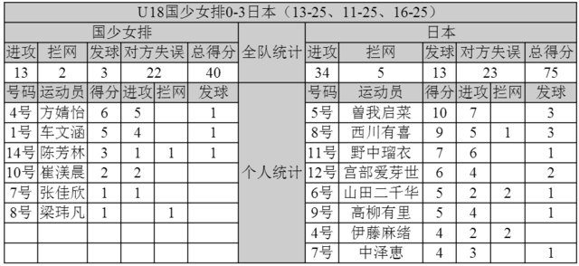 比赛焦点: 本届女排世少赛和全运会八强决赛圈的时间冲突,亚少赛荣膺第一副攻的毛钧怡、最佳接应孙小轩,以及超新星许璐瑶、主攻孙若箐和陈博雅等集体缺阵,只有最佳二传张梓涵跟随主教练徐建德参加世少赛,国少女排只能临时抽调八强之外的选手,其中不乏像车文涵这样的希望之星。 U18国少女排是徐建德执教,在首日轮空后于次日以0-3(22-25、8-25和5-25)被土耳其零封,无缘开门红的同时成绩是以0胜1负0分暂时垫底;日本分别是以3-0(25-23、26-24、25-18)击败秘鲁、3-0(25-20、25-8、25-19)再胜多米尼加,在前2轮以2胜0负6分暂居D组头名。 双方阵容: U18国少女排主动变阵4号方婧怡顶替3号刘雨,与10号崔渼晨、1号车文涵搭档进攻三叉戟,副攻6号焦点和7号张佳欣、二传14号陈芳林、以及从主攻改打自由人的5号刘晶晶继续出战;日本首发阵容是边攻手5号曽我启菜、8号西川有喜和9号高柳有里,副攻4号伊藤麻绪和6号山田二千华、二传1号中川、自由人3号水杉玲奈。 技术统计: 国少女排进攻13-34、拦网2-5、发球3-13落后日本,失误累计多达23次,其中包括一传丢分13次。接替刘雨首发的方婧怡斩获6分,三叉戟另外两翼车文涵和崔渼晨各获5分和2分,副攻张佳欣和替补梁玮凡同获1分,二传陈芳林独得3分;日本首发三叉戟曽我启菜、西川有喜和高柳有里各获10分、9分和5分,替补野中瑠衣和混血宫部爱芽世拿到7分和6分。