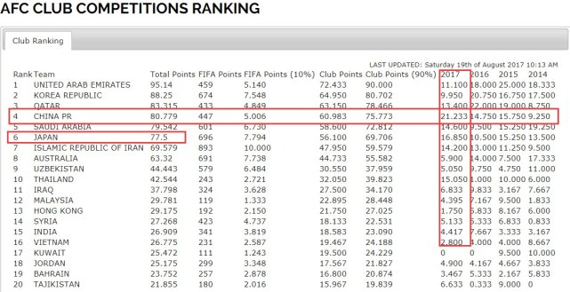 亚足联技术分中国东亚第2 亚冠若压日本名额变3+1