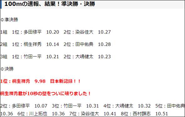 文 观察者网专栏作者 潘攻愚 独立撰稿人 9月9日,观察者网的一则报道可以说同时震撼了整个亚洲的田径界:日本短跑天才桐生祥秀在顺风1.8米/秒的情况下,以9秒98的成绩夺冠,并创造了日本男子百米的新纪录。 发稿时该成绩还有待国际田联确认,不过几个小时之后国际田联在其官方网站上记录下了这一刻。 桐生祥秀的这个成绩确实有幸运的一面,因为顺风1.8米/秒距离国际田联规定的2米/秒的合法线并不远,一场“合法的风”帮他破了纪录,不少不甘心的国人网友吐槽说这个比赛的级别比较低,只是日本大学生比赛;还有网友鄙视桐生祥秀年少成名后一直徘徊不前(17岁就成名了,到20多岁后成绩也没怎么提升过),而且一到国际赛场就萎靡,只能窝里横。但不管怎么说,这个成绩已被官方认证,写进了历史。