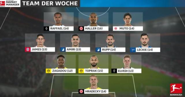 德甲官方第5轮最佳阵容:J罗MVP 日本前锋入围