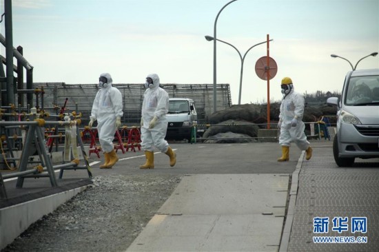 10月12日,施工人员从日本福岛第一核电站内走过。新华社发 |