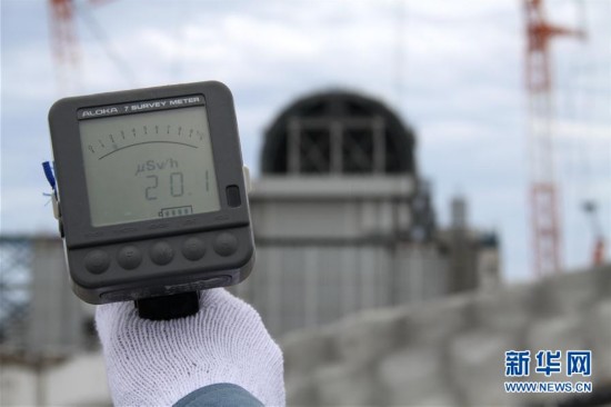 10月12日,在日本福岛第一核电站内,工作人员使用放射性计量仪测量3号反应堆附近的辐射值。新华社发 |
