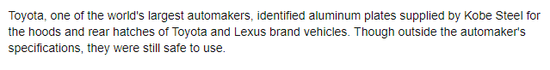 17日,美国司法当局已要求其提交数据造假相关产品文件,神钢表示将会配合调查 在本次神户钢铁造假门之中,铝制品是重灾区,钢制品、铁粉和铜制品也无一幸免。举例来说,截至目前,丰田、斯巴鲁、铃木、马自达等日系车企已确认其乘用车产品采用了神户制钢生产的铝制品,相比运用于非重点区域的铝制品,神钢的铁粉、钢材也在13日被曝出造假。