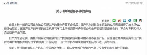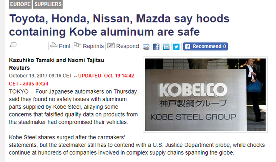 明确承认了实际上神户制钢产品并不符合标准,不过丰田声称使用上是安全的…… 10月19日,经网易转欧洲汽车新闻网转路透日本记者大作的新闻报道称,丰田、本田、尼桑、马自达公司声称虽然神户制钢产品并不符合汽车制造商的标准,但是使用上仍然是安全的。 同时日产正在忙着召回车辆和宣布中国合资企业并未使用神钢产品。