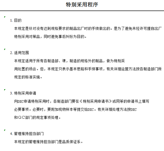 “不合格品”出厂正规手续,其步骤之准确细腻再加上部、课的用词,是谁用的一目了然 在国际通行的质量标准中,虽然允许未达到规格要求的制品出场时降规格处理。不过这次也有神户员工爆料,神户制钢将过去交货后没有造成问题的不合格产品的事例制作成名为“特别采用范围”的笔记并传达给历代负责人,作为是否可以瞒着客户交货的判断标准。这显然不是正常的降规格行为。