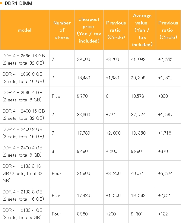 DDR4-2133 16GB×2套装就是其中代表,目前最低价为31800日元(¥1885),均价高达40071日元(¥2375),比一个月前分别涨了3800日元、5574日元,涨幅分别达12%、14%。 DDR4-2666 16GB×2套装的最低价、均价也涨了8%、2%,后者也突破了4.1万日元,其他各种型号也都有不同程度的上涨。