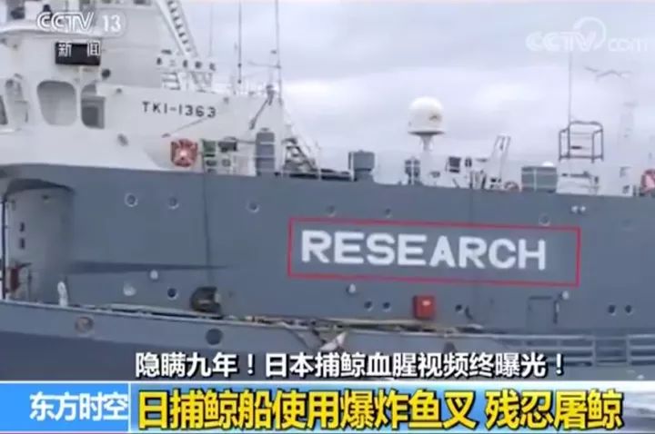 鲸被刺中后鲜血很快染红了海面,拖行一段时间后,死亡的鲸被头朝下拖到船上,场面惨不忍睹。视频中可清晰看到日本捕鲸船上写有“科学研究”字样。