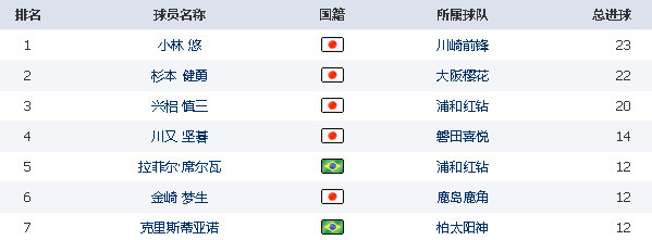 腾讯体育讯 北京时间12月5日 日本J联赛落幕,川崎前锋上演大逆转神奇夺冠。而在射手榜上,日本的本土球员非常强势,前四无一例外都是日本球员。【题】 J联赛射手榜 来自冠军球队川崎前锋的小林悠以23个进球夺得金靴,他的场均进球数达到0.68个。银靴得主是来自大阪樱花的杉本健勇,他打进22球,场均打进0.65球。铜靴获得者是浦和红钻的兴梠慎三,他一共打进20球,场均进0.61球。 排名第四的是磐田喜悦的川又坚碁,共打进14球。一共有3名球员打进12球,并列排名第5,直到此时才出现外援的身影,分别是浦和红钻外援拉斐尔-席尔瓦和柏太阳神前锋克里斯蒂亚诺,另一个也是日本本土球员、鹿岛鹿角中场金崎梦生。 而在中超射手榜上,本赛季前20名中只有武磊1名本土球员,也是中国球员中唯一进球数上双的,郜林以9球排名第21。中国男足备受锋无力问题的困扰,和本土前锋在联赛中能踢主力,能进球的不多有极大关系。 (歌德)