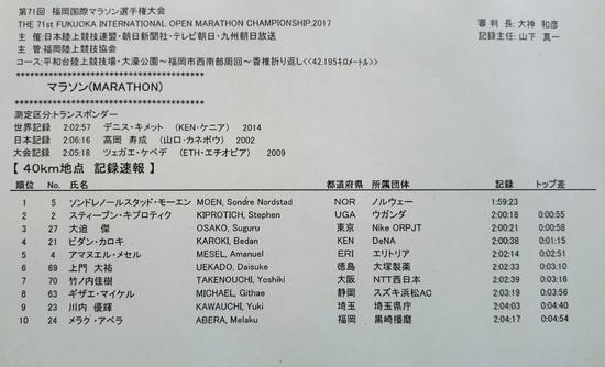 到达40公里时,穆恩始终能够保持2分55秒的配速,其他几人都有不同程度的掉速,跑在第2的基普罗蒂奇落后穆恩达40秒之多。最终挪威人一鼓作气拿下冠军,他的完赛成绩为2小时05分48秒,这个成绩打破了欧洲马拉松的纪录,穆恩成为了历史上跑的最快的欧洲人,同时这也是福冈马拉松历史第二快成绩,比赛会纪录慢了30秒。