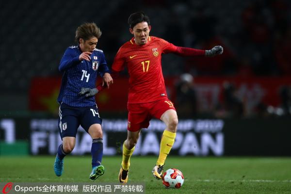 中锋肖智和对手拼抢。Osports 图 对于中国队最具威胁的地方,植田直通说:“我觉得还是高度最有威胁,不过防守抢断上我还是有自信的。” 本场比赛里皮相比对阵韩国,对阵容进行了部分调整,其中就有日本队忌惮的身高调整。 U23球员中韦世豪、何超、高准翼和刘奕鸣继续首发,门将位置换成了王大雷,中后场赵宇豪和傅欢出场,前场位置则派上了高中锋肖智。 在比赛中,中国队和日本队基本处于均势,双方对于进攻都办法不多,中国队还一度在上半场30分钟后占据主动。 不过下半场最后阶段,日本队连续发动进攻,利用长传和中锋策应,还有昌子源的超级世界波,敲开了中国队的球门。
