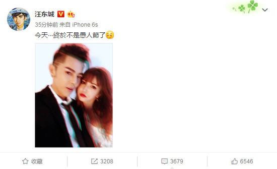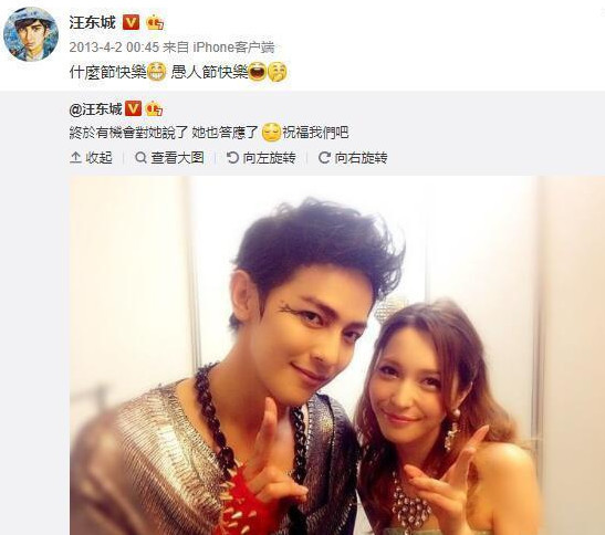 汪东城晒照公开恋情 腾讯娱乐讯(文/冉蕊)今天(1月16日)下午,汪东城在微博晒出自己和一女生的亲密合照,并配文称“今天……终于不是愚人节了”,对应2013年愚人节发布的“表白”微博,疑似公开恋情,而女生被指疑为日本模特藤井莉娜。随后,汪东城通过经纪人向腾讯娱乐独家回应:“希望给我空间”,无疑默认恋情,但对于女方的身份并未给予确认。 1月16日下午,汪东城在微博晒出一张模糊的合影,并写道:“今天,终于不是愚人节了。”照片中,汪东城与一名女子紧紧相依。尽管照片模糊,但仍有眼尖的网友指出女子疑似为日本名模藤井莉娜(编者注:藤井莉娜,日本模特、歌手,1984年7月2日出生于东京都,是一名具有四分之一美国血统的混血儿)。 关于汪东城微博发出的这句话,网友们也认为颇有深意,原因是早在2013年,录制《原来是美男》原声带的汪东城曾上网整人,在微博放上与日本混血名模藤井莉娜(Lena)的合照,还暧昧的写着“终于有机会跟她说了,她也答应了,祝福我们吧”!但汪东城的留言却没骗到粉丝,马上就被识破,他只好回应“愚人节快乐”! 如今,汪东城放话“今天,终于不是愚人节了”,引发网友猜测纷纷:莫非这是主动公开恋情了?而且,就连汪东城的两位好兄弟也下场助攻,疑似在盖章俩人恋情。郭品超转发调侃称“离开我是对!祝你幸福?”,辰亦儒也表示“保鲜肉三兄弟的另两位等着当你的伴郎”。 辰亦儒为好友送祝福 随后,腾讯娱乐联系到了汪东城方面,其本人通过经纪人向腾讯娱乐独家回应道:“请给他空间”,无疑默认恋情。但关于女方身份等其他细节,对方始终没有给出明确答复,“谢谢大家关心,其他我也还不清楚,他还在工作。” |