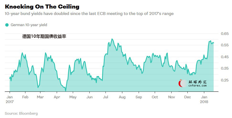 外界预期欧洲央行(ECB)接近退出超宽松货币政策之际,10年期德债收益率在1月触及六个月高位0.579%,从去年12月的数月低位0.275%反弹。明治安田生命首席经济分析师小玉佑一说道:“除美联储(Fed)之外其它央行的货币政策正常化,是吸引市场注意力的一个题材,焦点在于欧洲央行的退场策略,以及日本央行的市场操作。”