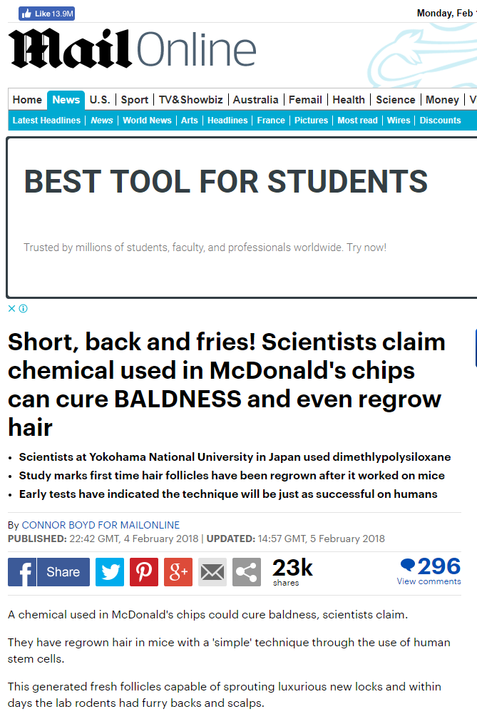 福克斯新闻、每日邮报网站截图↑ 以福克斯新闻网的这篇文章为例,该文表示,日本横滨国立大学的研究人员发表了一项研究成果,发现使用一种名为二甲基聚硅氧烷的化学物质,可作为培养基来培养毛囊干细胞。之后研究团队将这些毛囊干细胞植回老鼠表皮上,成功生长出5000个新毛囊,这些毛囊还进一步长出健康的毛发。该研究前不久发表在“生物材料”(the Biomaterials journal)杂志上,测试表明这种方法也可能被用于治疗人类脱发。科学家补充说,毛囊成长的原因是该化学物质使得氧气容易通过,就促进了头发生长。日本横滨国立大学教授福田淳二(Junji Fukuda)表示,虽然还有更多的研究需要做,但他希望这种技术将被用于改善人发再生疗法,以治疗脱发如雄激素性脱发。福克斯新闻网的文章也提到了,二甲基聚硅氧烷这种化学物质,也通常被添加到薯条等油炸物中作为消泡剂使用,防止在炸熟过程中食用油起泡飞溅。