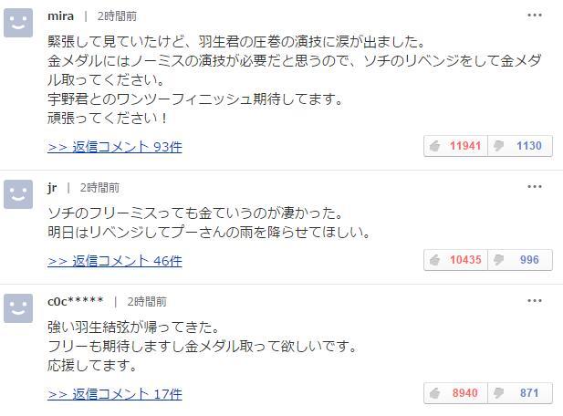 腾讯体育2月16日讯 平昌冬奥会花样滑冰男子短节目比赛结束,日本卫冕冠军羽生结弦用完美动作征服全场,高居榜首。他的表现征服了日本网友,赛后相关搜索中一直居前列。 羽生结弦可以说是本届冬奥会最大牌的运动员之一,上一届索契奥运会,他就拿到了这个项目的金牌,日本网友对他是寄予厚望。“羽生的心理素质真是太棒了!看了他如此精彩的表现真的非常感动!既自如又完美,会一直为他应援。” “顶住受伤和大家的高期待的压力是需要很强大的心理素质。我觉得羽生结弦是一位非常优秀的年轻人。” “羽生结弦简直是神一般的存在!异次元般神奇的人表现让我非常感动。” 日本网友将羽生比作心中的神,确实是表现太完美。还有日本网友将观战时的激情情绪描述出来,“紧张端正的坐着看完了比赛,相当高度的注意力和精力”。 “啊,羽生这孩子真是个天才啊!深深地被感动了,以至于我的眼泪都流下来了。”,“虽然观看比赛非常紧张,但是羽生完美的表现还是令我落泪了。” 对于明天比赛,日本网友纷纷展望,这一枚金牌,应该是不会旁落他人。“我觉得想要取得金牌必须要零失误的表现,请像索契冬奥会一样取得金牌吧。”“我也非常期待和宇野最后的决战,加油吧!”“索契冬奥会上虽然有一点小失误但也取得了冠军真是太厉害了。希望明天也可以下一场维尼熊雨。”(思奕) |