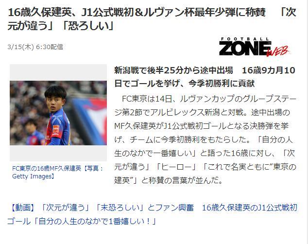 腾讯体育讯 北京时间3月15日 日联杯小组赛第二轮,FC东京主场1-0击败新泻天鹅。16岁的久保建英为FC东京打进了制胜球,这个进球是久保建英在东京一线队的首个进球,打破了日本杯赛最年轻进球纪录。 在比赛的第70分钟,久保建英替补出场,随后在第76分钟,久保建英在禁区前沿接应队友的回传,面对对方球员的围追堵截,久保建英带球突入禁区左侧小角度低射远角破门,凭借久保建英这粒精彩的制胜球,FC东京主场1-0击败新泻天鹅。 这个进球是16岁的久保建英升至FC东京一线队以来的首个正式比赛进球,同时久保建英也以16岁9个月零10天的年纪,打破了森本贵幸所保持的日本杯赛最年轻进球纪录。 久保建英在日本足坛一直备受关注,不仅是因为他是拉玛西亚青训出品,而且久保建英确实拥有很高的个人天赋,被誉为是日本的天才少年,日本的“梅西”。久保建英能够在16岁的年纪就踢上日本的顶级赛事,而且还能取得进球,赛后也受到日本媒体和球迷的狂赞,有日本球迷在社交媒体发文称,“这简直是异次元的带球突破!”“好像看到另外一个世界的人!”“不愧是巴萨青训出道的球员啊!”“可以进日本国家队了!”“应该可以去参加俄罗斯世界杯吧!” 久保建英2015年离开巴萨青训,返回日本加盟东京FC,本赛季初久保建英正式被上调至FC东京一线队,本赛季久保建英各项赛事已经为FC东京出场了4次打进1球,虽然久保建英16岁就已经能够在日本顶级联赛崭露头角,但是久保建英这样的天才少年毕竟是凤毛麟角,甚至可以说是现象级的球员。而随着中超联赛新政的实施,中超也有越来越多的年轻球员能够获得充足上场的时间,相信在不久的将来,我们也会有更多的“久保建英”横空出世。 (图科) |